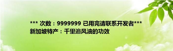 大家好,综合小编来为大家讲解下。*** 次数:9999999 已用完请联系开发者*** 新加坡特产:千里追风油的功效这个很多人还不知道,现在让我们一起来看看吧!