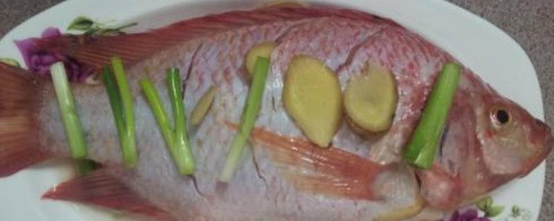 将红鱼放入盘中,放入生姜和料酒腌制10分钟。