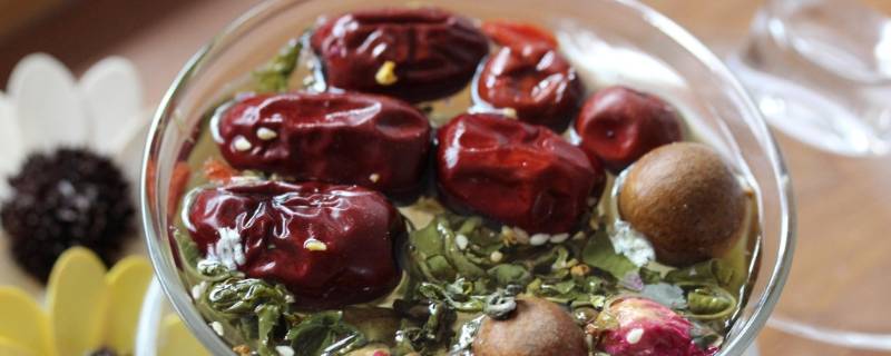 三泡台的材料:茶叶、枸杞、红枣、桂圆、冰糖、胖大海、杏干、菊花、葡萄干、山楂、月见草花等。