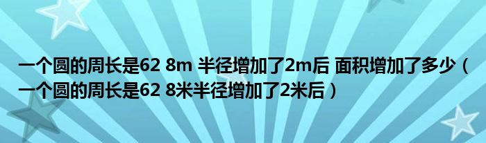 大家好,小联来为大家解答以上的问题。一个圆的周长是62 8m 半径增加了2m后 面积增加了多少,一个圆的周长是62 8米半径增加了2米后这个很多人还不知道,现在让我们一起来看看吧!