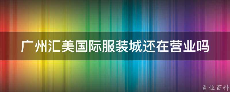 广州汇美国际服装城还在营业。汇美国际服装城是中高端品牌女装、男装、童装等货源批发市场,位于广州市荔湾区环市西路139号汇美大厦。该服装城营业时间为早上9点到晚上6点,是广州服装批发市场中的大型专业批发市场之一。