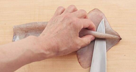6、在乌贼鳍的表面中央纵向划下切痕,并从这里将皮剥掉。