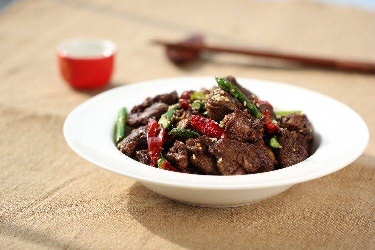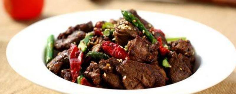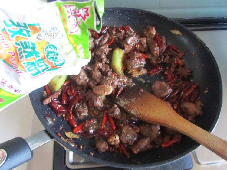 14、直至翻炒表面兔肉干干的,再下入孜然粉,继续翻炒。
