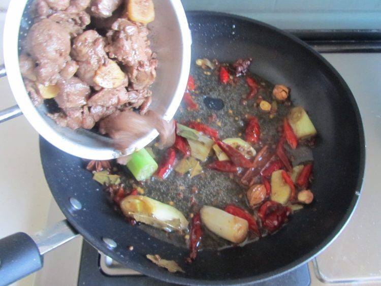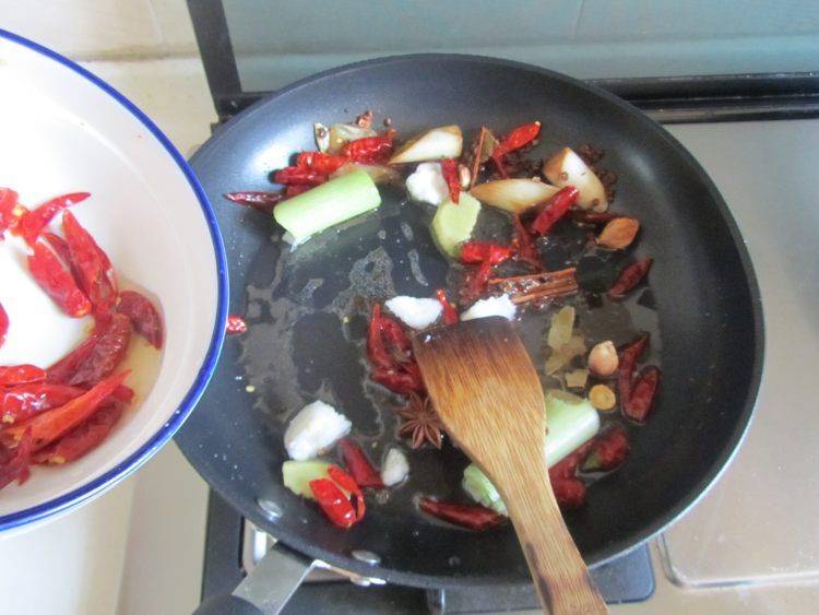 10、加入准备好的大料和一半辣椒小火慢慢煸炒。