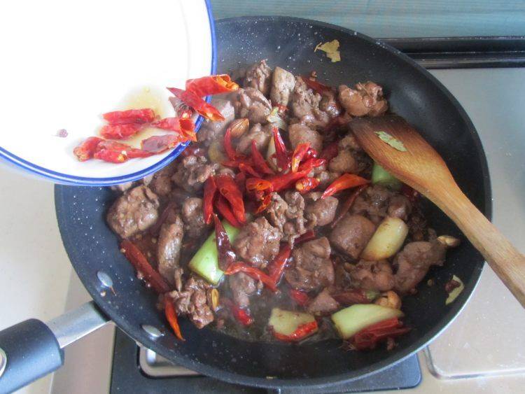 13、不停的煸炒,中间加入另一半干辣椒,继续翻炒。