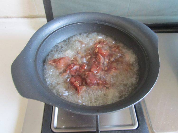 7、锅中倒入适量的油,油烧制七成热时下入腌制好的野兔块。