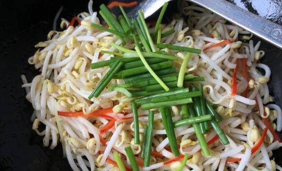 5、倒入豆芽,同时调入盐,大火快炒。