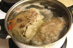 4、再接一锅清水,放入扒皮后的牛舌,加入除了大蒜和酱油外的其它所有调料,大火煮开后转小火,再煮大概一个小时十五分钟至筷子可以轻松地扎进去。