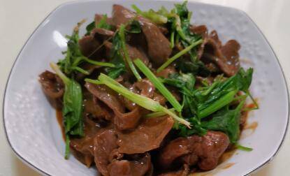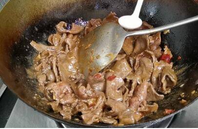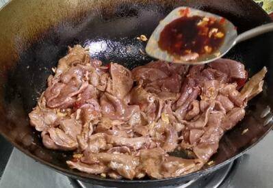 牛心切片,加入锅里翻炒。