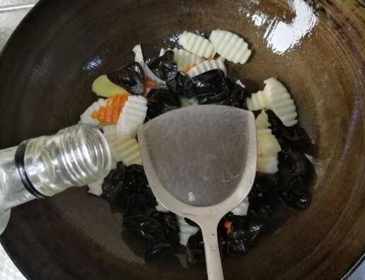 7、翻炒一分钟后,倒入黑木耳继续翻炒。