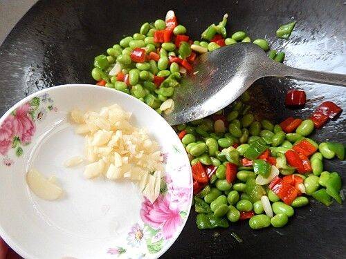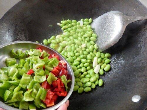 1、食材准备:毛豆150克、大蒜、精盐、生抽、菜籽油、青椒、红椒各适量。
