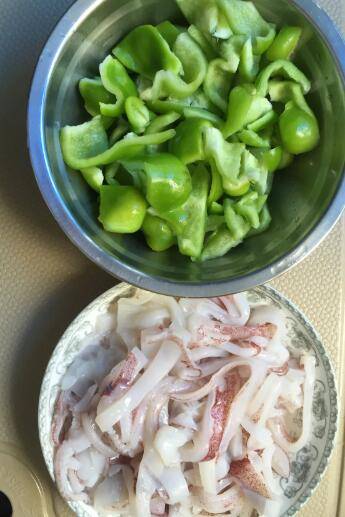 1、鱿鱼洗净,切细条。青椒洗净,切块。