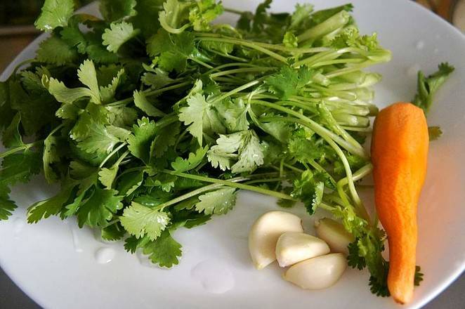 2、香菜摘洗干净,控净水分,胡萝卜去皮洗净,大蒜去皮洗净。