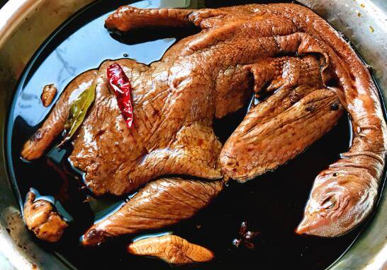 用料:鹅1只、湖羊酱油2400g、干辣椒3个、花椒1勺、生姜4片、冰糖50g、白糖60g、桂皮1块、八角3个、丁香1小勺、香叶3片、白酒150ml。
