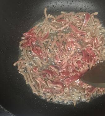 2、锅中倒入适量的油,烧至八成热,放入肉丝翻炒至肉变色。