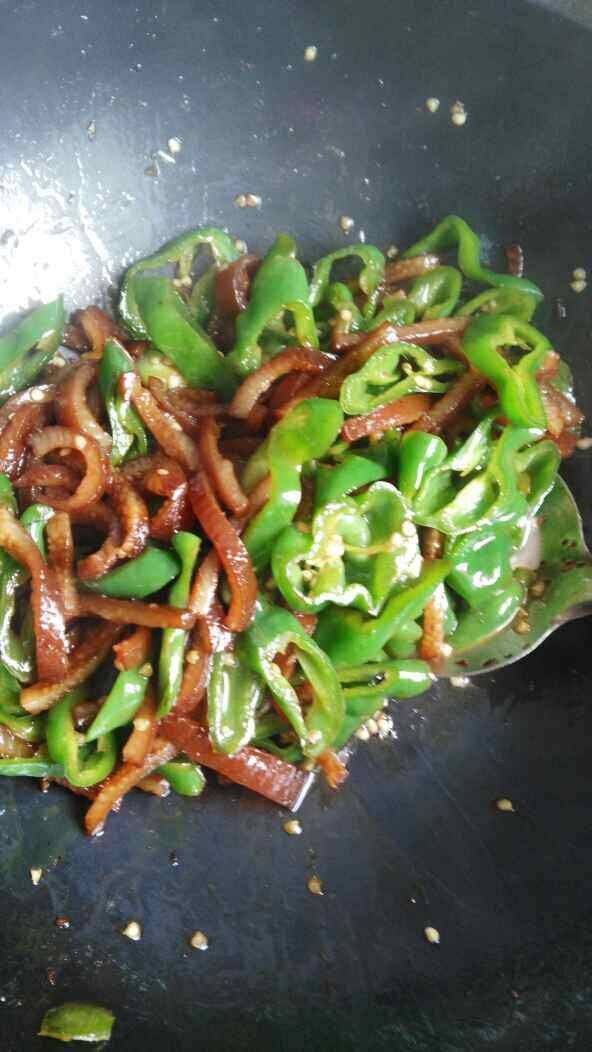 4、放卤猪皮翻炒片刻。