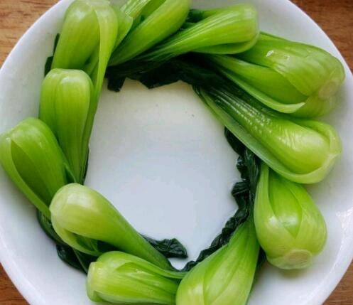 1、青菜洗净焯水,浸凉开水,摆盘。