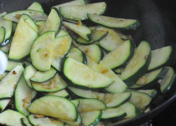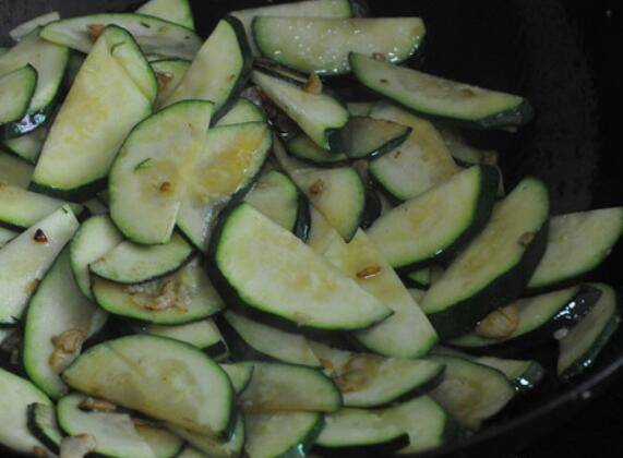 4.大蒜香气飘香,微微发黄后将节瓜片倒进去,一起翻炒至均匀裹上油。