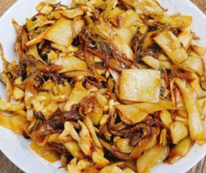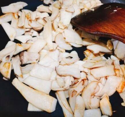 6.起锅,直接放入杏鲍菇,干煸。杏鲍菇煸的时候会出水,煸至边角微黄。