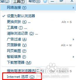 1、首先打开浏览器,然后点击工具菜单中的Internet选项,如图。