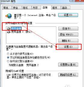2、然后切换到连接选项卡,选择我们的宽带连接,然后点击设置按钮,如图。