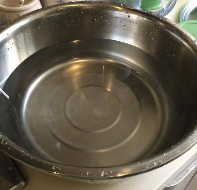 锅烧开水保持小火,准备一个不锈钢盘,舀一勺粉浆入盘中,转匀(布满盘疷),等液体变白,倾斜盘子,让沸水流入盘中,等粉皮透明。