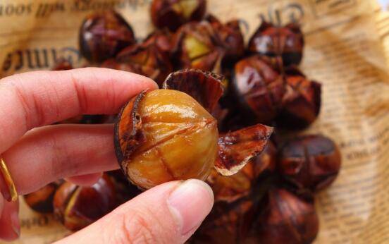 板栗清洗干净,用刀割出十字口,摆入锅中。