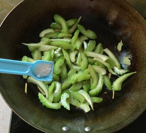 3、芹菜掐掉老筋,斜切厚片,红椒切块,生姜切丝。