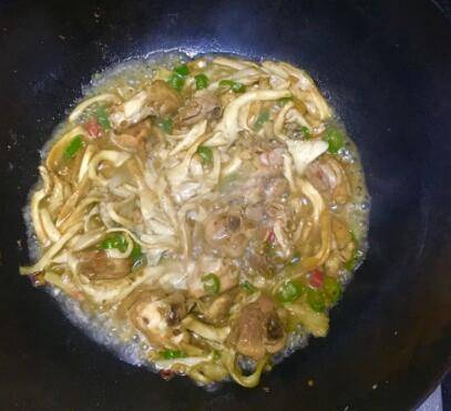 炒软之后鸡肉同炒,加生抽和盐调味,翻炒均匀以后,加适量清水,盖着焖一下,等水分收的差不多,即可关火装盘。