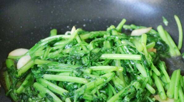 3、先放入茼蒿茎部略炒,再放入茼蒿叶。