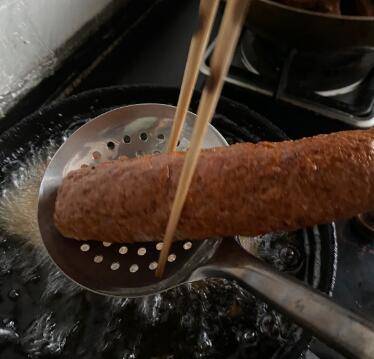 6、轻轻放入油中,约一分钟,从另一端轻轻抽出油纸,烧肝煎至表面金黄定型,捞出控油,摆入容器中。