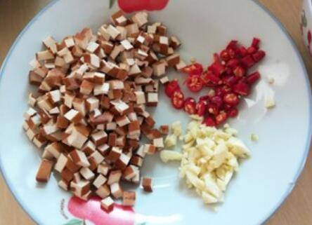 2.酱豆干切丁,蒜切碎,辣椒切段。