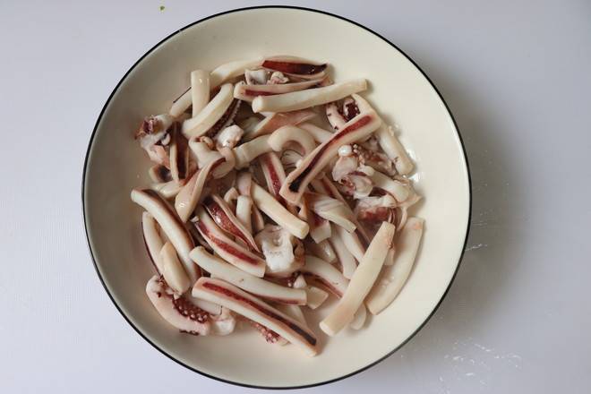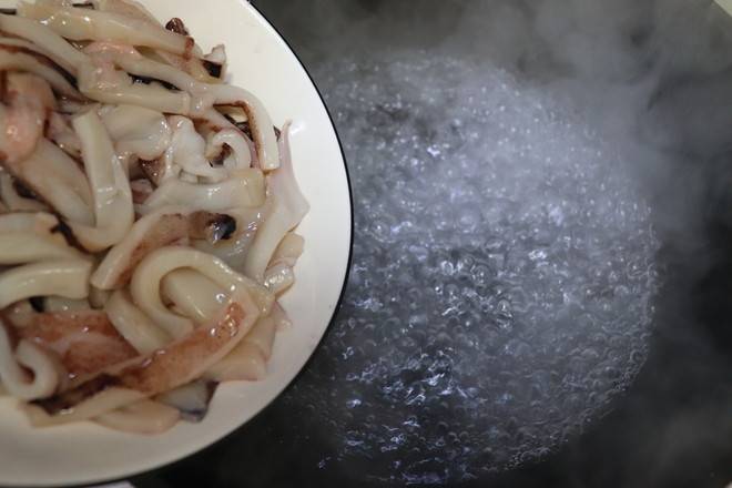 3、鱿鱼开水下锅焯一分钟,捞出备用。