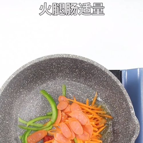 4、锅中倒入番茄、胡萝卜、火腿肠翻炒均匀。