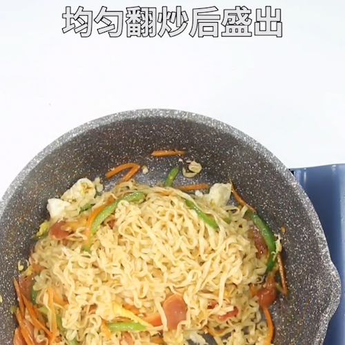 5、倒入方便面、鸡蛋及煮备好的调料翻炒均匀即可。
