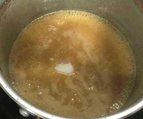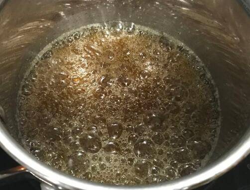 开中火加热砂糖和水,糖水煮开后转小火(此时开始加热鲜奶油)。