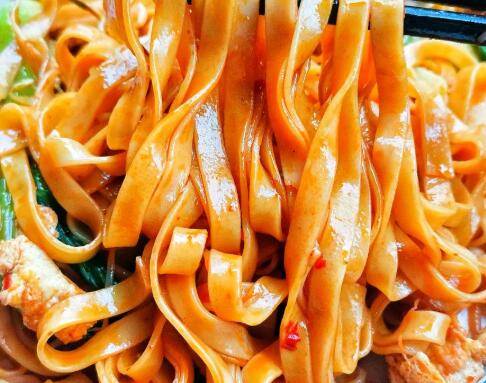 加入河粉,加生抽、老抽、蚝油、老干妈,加入鸡蛋翻炒均匀。