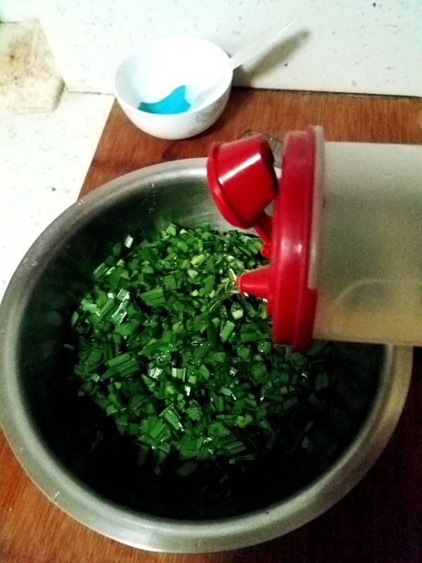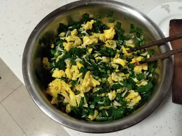 10、待鸡蛋碎自然凉后,倒入拌好的韭菜中,再次拌匀。