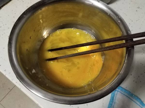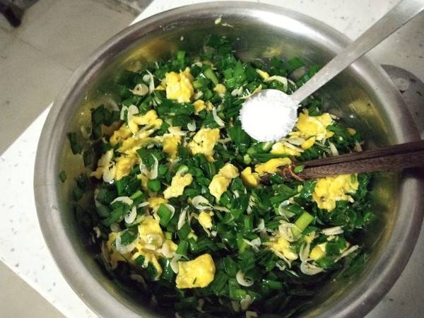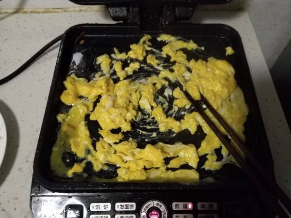 韭菜鸡蛋馅的鸡蛋炒法:鸡蛋加一点点盐后搅散,用电饼铛淋加热,同时用筷子不停的搅动,让鸡蛋直接炒成鸡蛋碎。