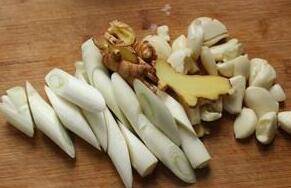 将蒜瓣拍破,老姜切成片,葱白斜切成圈;锅烧热,加入2大勺香味蔬菜油,加入碎冰糖熬化,加入豆瓣酱、豆豉碎中小火熬出香味。