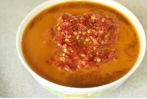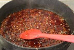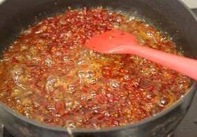锅烧热,加少许油,放入打好的糍粑海椒,中小火慢慢熬干水分,至油色鲜红透亮。