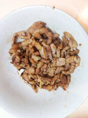 4、锅中热油,倒入肉丝炒至变白,加少许盐,半勺老抽调色,盛出。