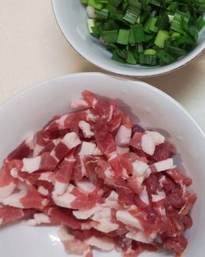 2、大葱切片、青椒切丝,可放一个朝天椒点缀。