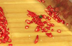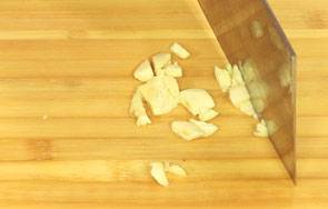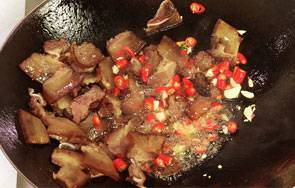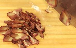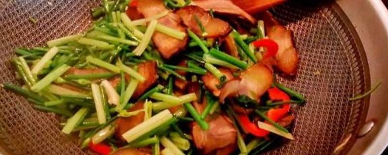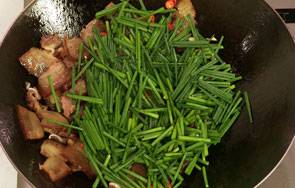 2、腊肉汆熟切片, 韭菜花洗净切段。