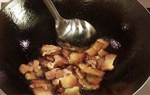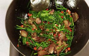 11、加适量盐、味精翻炒至熟,淋入少许料酒,拌炒匀。