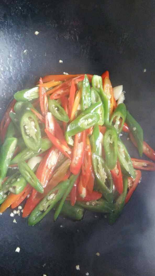 5、热锅放油,放大蒜辣椒爆炒片刻。