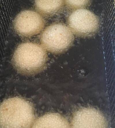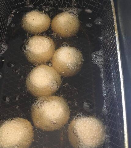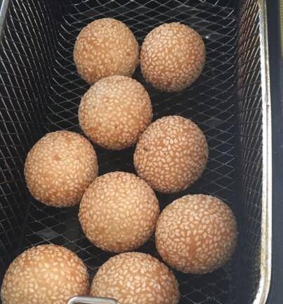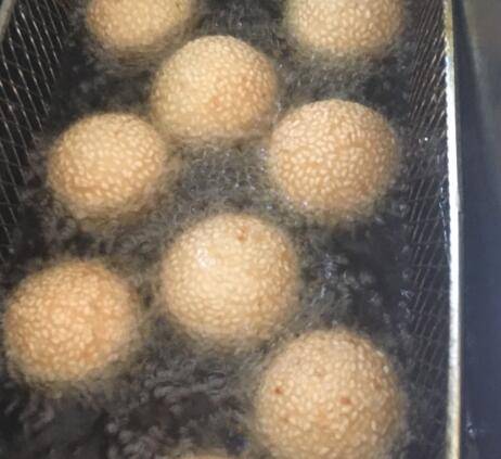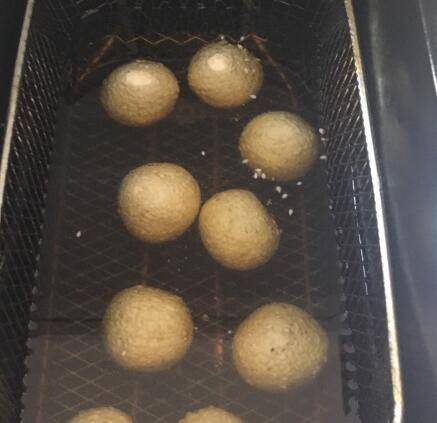 继续加温至150度,开始大气泡去,麻球开始表面发硬,让麻球一直翻滚,直到表面金黄,如若有地方没有炸到,我教你一个补救的办法,把炸篮提起来只让底部接触油,没有炸到的地方朝下再炸一会就均匀了。