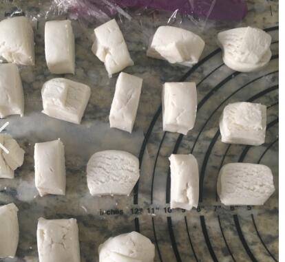 把豆沙馅儿分成5g一个,把糯米粉搓成长条分成20g一个,大约18个。