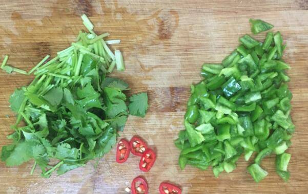 用料:青椒一个、香菜四五棵、杭椒一根、醋少许、生抽一汤匙、白糖少许、香油少许。