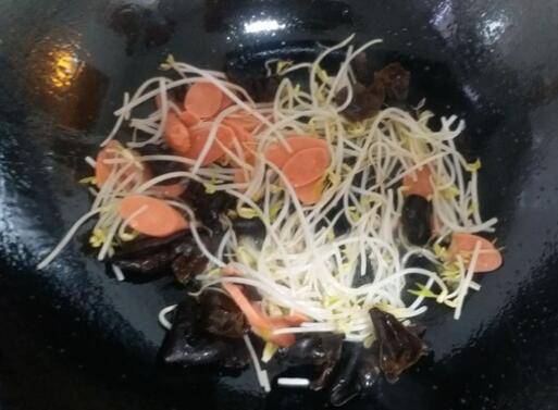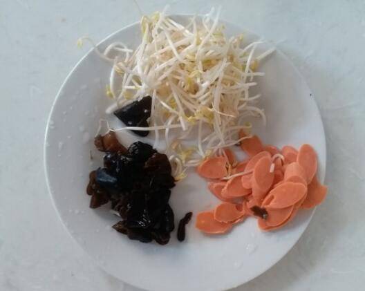 4、豆芽,黑木耳浸泡后洗净,火腿肠切片待用。